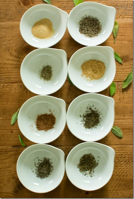 - 1/4 teaspoon each of sage, thyme, nutmeg, oregano and basil